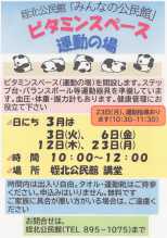 〇ビタミンスペース(運動の場) 3月3日・6日・12日・23日 〇高齢者教室のお知らせ 3月10日 〇乳幼児ふれあい学級 3月14日・19日 〇マリンバ演奏会 3月15日 〇おとな塾 3月24日 〇なんかからんneめいほく 3月25日 〇地域カフェに寄ってみませんか 3月25日 |
